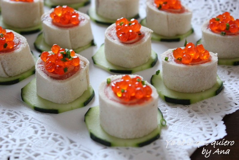 Para servir, colocar en una bandeja poniendo un rulo sobre una rodaja de pepino y rematar con unas huevas y un poco de cebollino picadito.