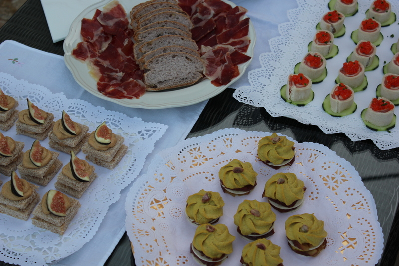 Tomaremos » Rulos de Salmón con huevas y crema de Yogur», » Bocados de Manzana y Pavocurry» y » Montaditos de Foié con Brevas de Albatera».