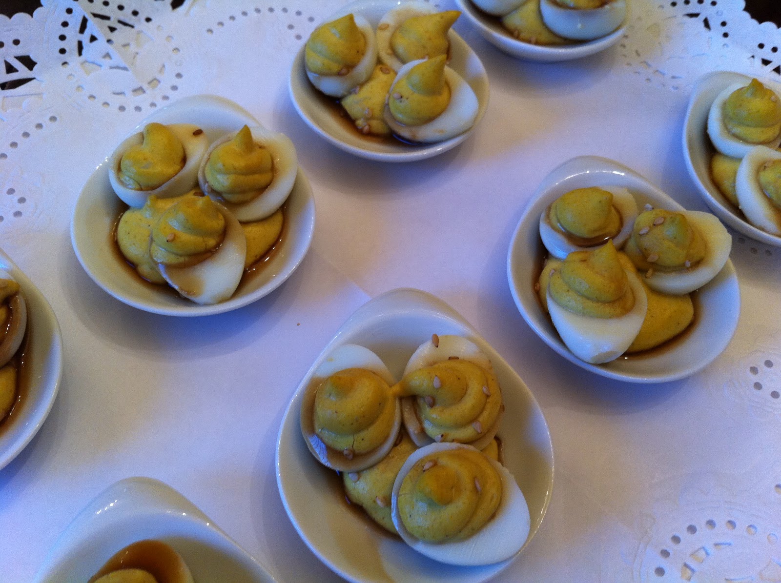 Emplatar en pequeños platitos colocando en cada uno tres mitades sobre un poco de la mouse resultante  e ir rellenando cada huevito con la misma. Espolvorear con unas semillas de sésamo.