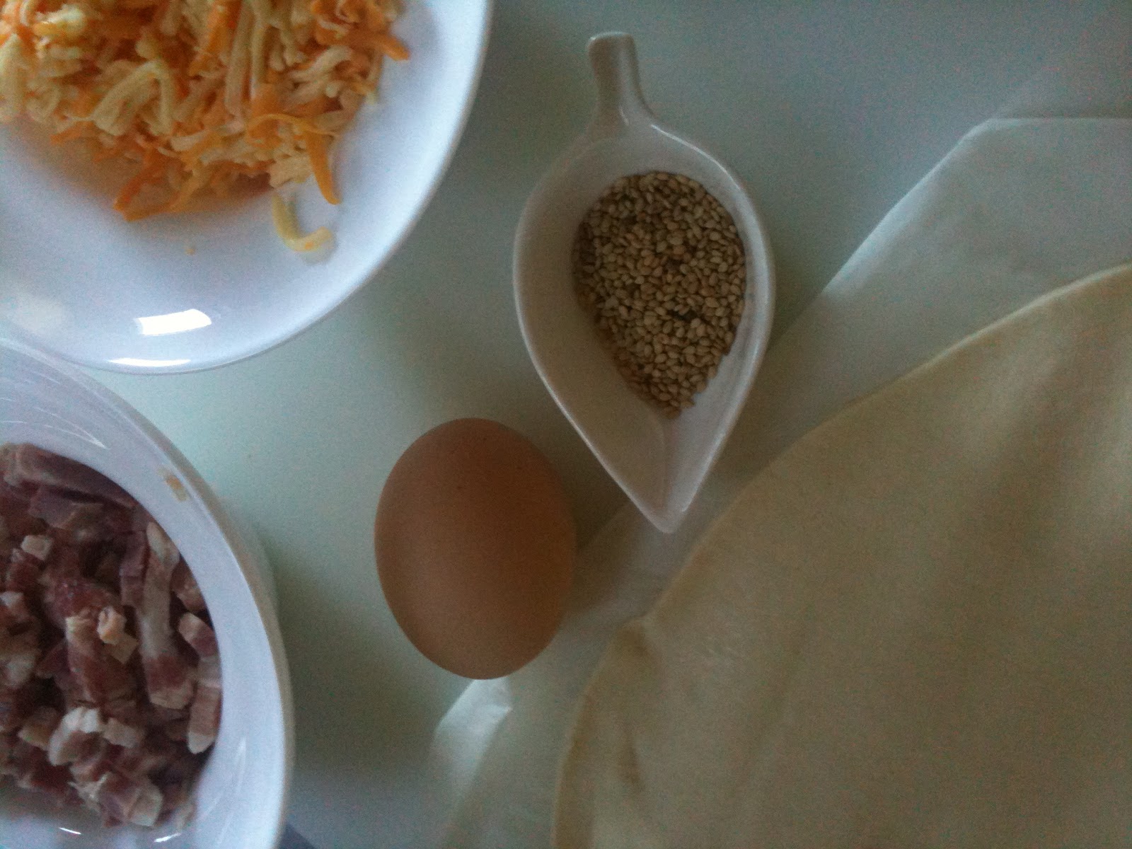 Esparcir el bacon y el queso sobre una base de hojaldre y cubrir con la otra base. hacer un rulo y cortar en porciones. Amasar presionando con los dedo y darles a cada porción forma de bollito. Meter al horno precalentado sobre papel de hornear a 180º grados. Pintar con huevo batido y espolvorear con semillas de sésamo. Hornear hasta dorar.