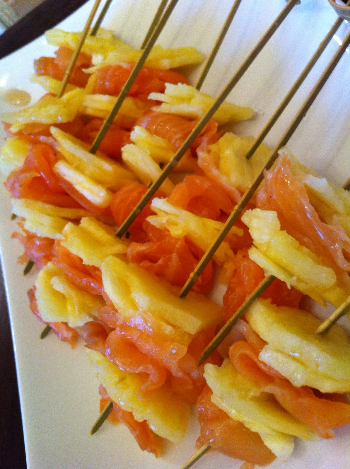 Alternar una loncha de salmón con otra de piña en una brocheta de bambú y emplatar.