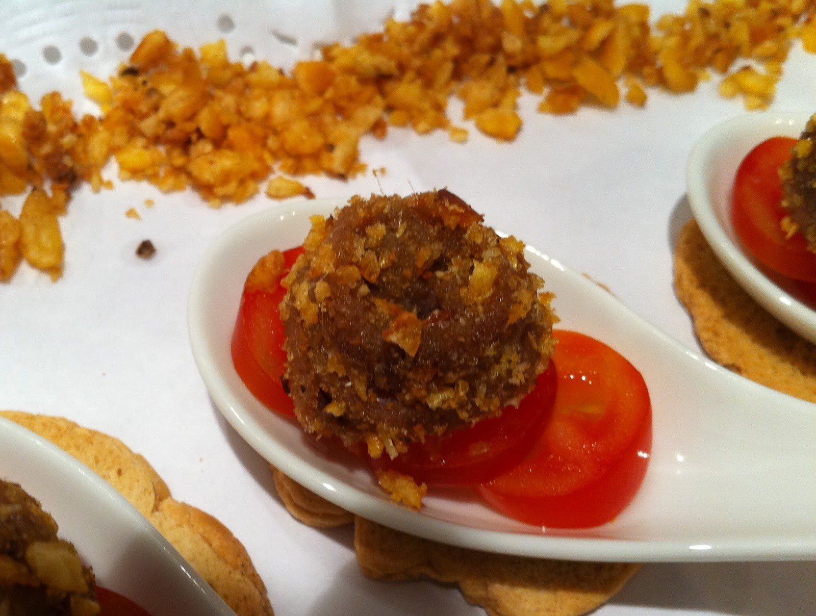 Cortar los tomates en rodajas finitas. Rebozar las anchoas en el maíz triturado y enrollar colocando y sobre 3 rodajitas de tomate en cada cucharilla y colocar éstas sobre un rebanadita de pan tostado.