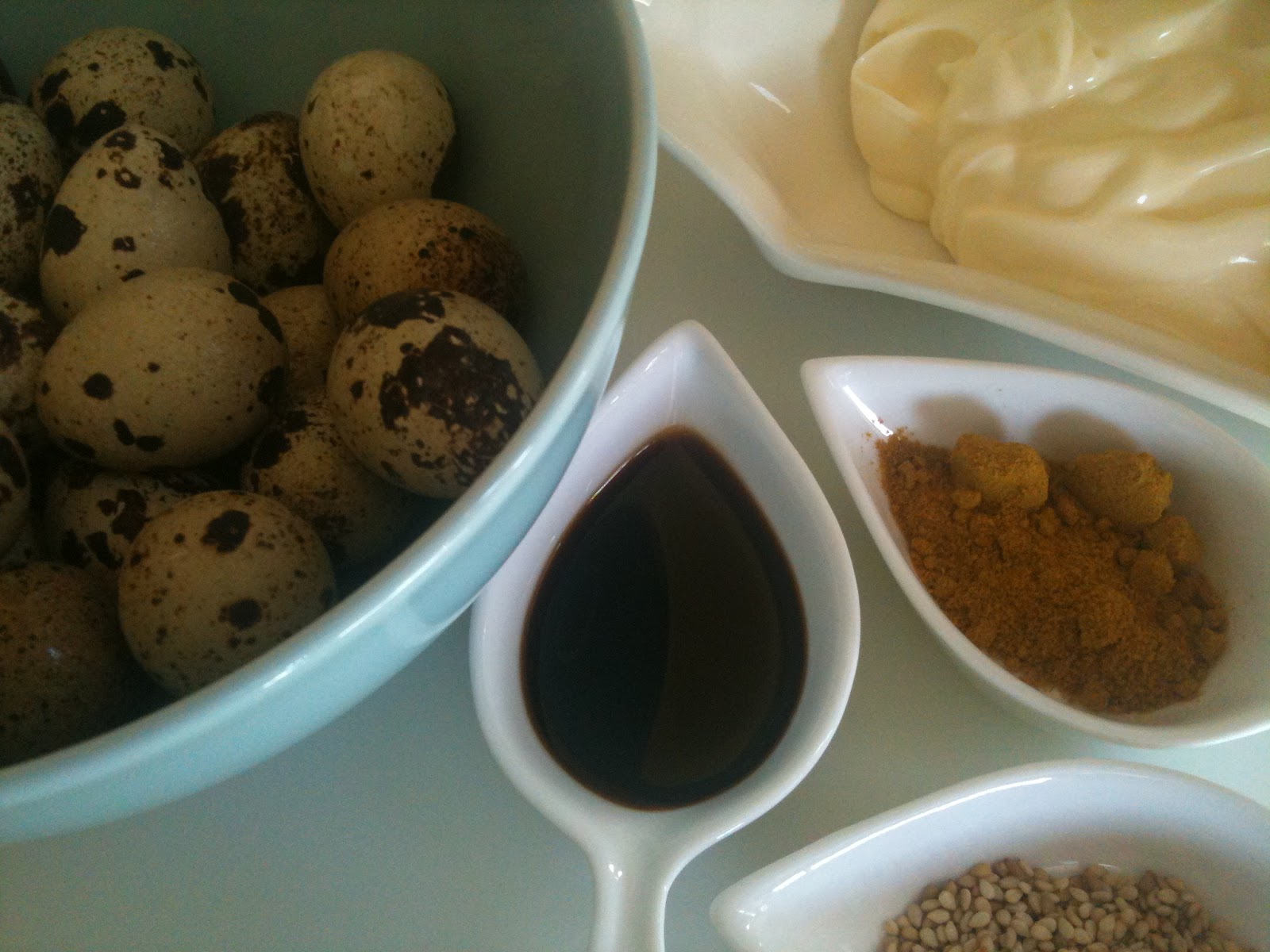 Pelar y partir los huevos por la mitad y reservar 30 mitades vacías de yema. Triturar el resto con la mayonesa, el curry y la soja . Poner en una manga pastelera desechable .