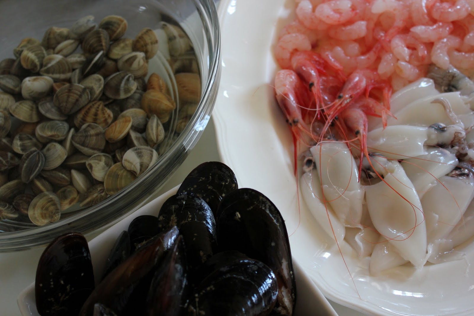 - 1 1/2 litro de Caldo ( preparado con las cáscaras de las Gambas y el agua de cocción de Almejas y Mejillones)