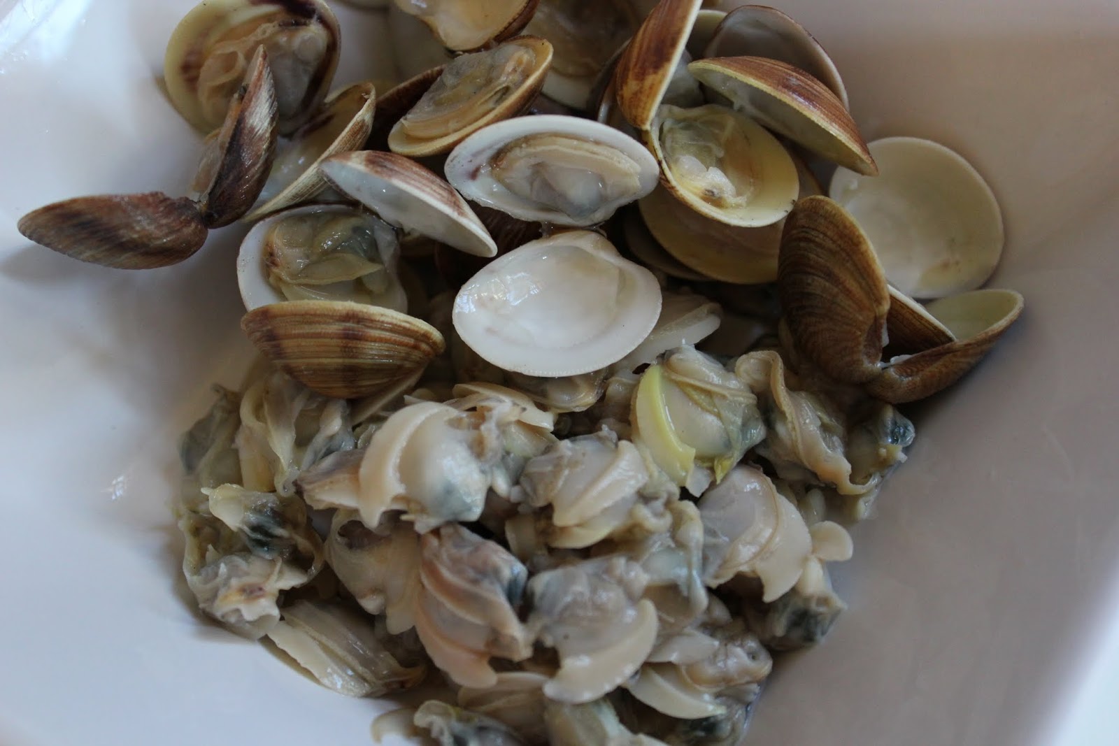 Ponemos las almejas en agua fría con sal para que suelten la arena si la tuvieran. Pelamos las gambas (guardando una sin pelar para cada comensal) y reservamos mientras cocemos las cáscaras y cabezas que nos servirán para el caldo en agua con la sal.