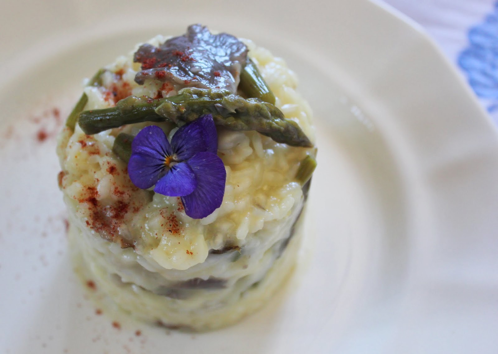 Pelamos y picamos la cebolla en brunoise y la ponemos a pochar en la mantequilla a fuego medio-alto mientras en una sartén aparte salteamos los trigueros y las setas con el aceite de oliva. Cuando la cebolla empiece a transparentar, añadimos el arroz, salpimentamos y rehogamos medio minuto mezclándolo bien con la cebollita pochada, agregamos los trigueros salteados y las setas y ponemos el vino. Removemos y dejamos reducir un minuto antes de empezar a añadirle el caldo caliente en tres veces y removiendo con frecuencia para que el arroz suelte toda su crema. Cuando el caldo aún no haya consumido del todo rectificamos de sal y retiramos del fuego. Le incorporamos el queso rallado removiendo bien para que se integre perfectamente con el arroz y servimos espolvoreado por una pizca de Tandori Masala (o pimentón dulce) y rematamos con una flor comestible.