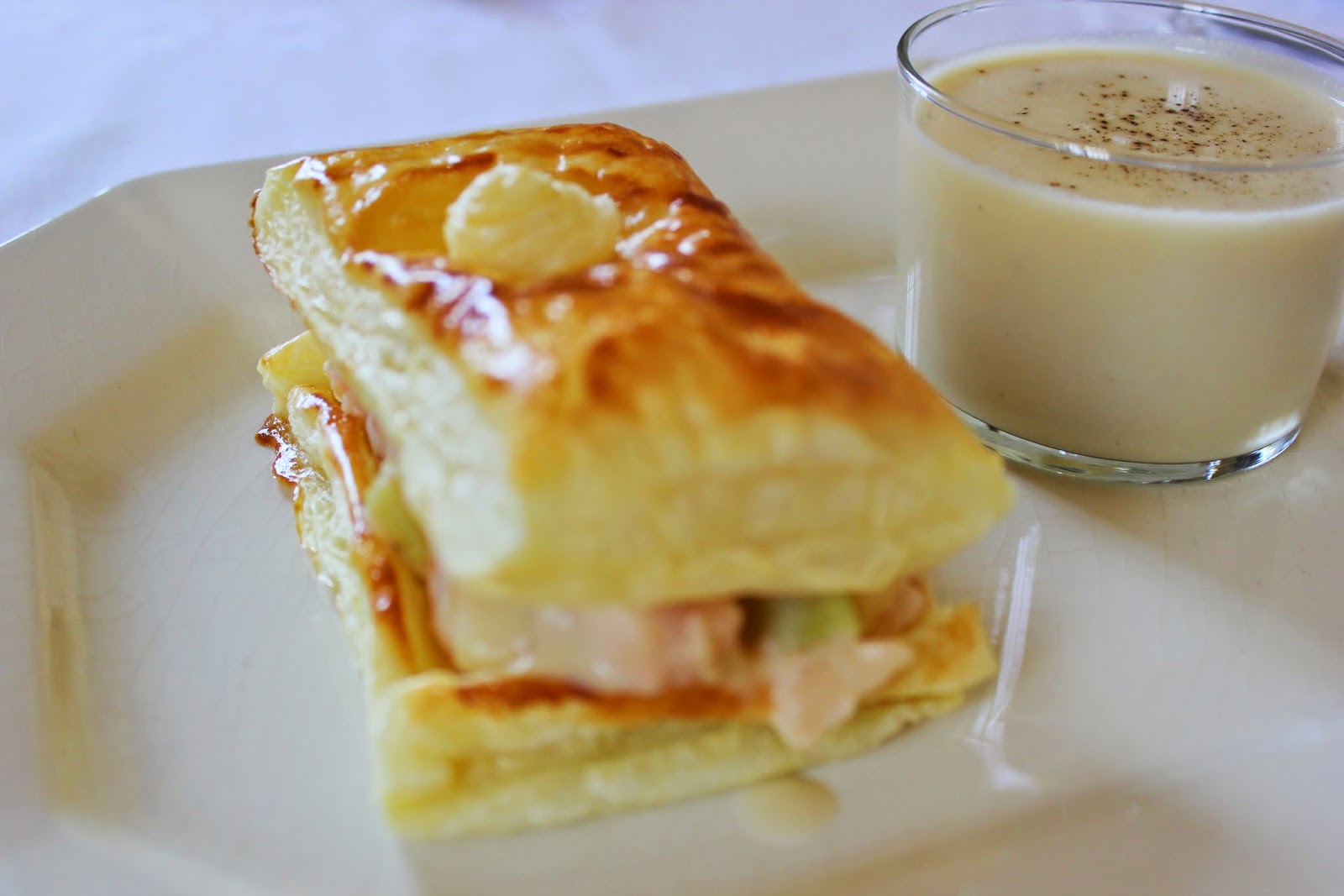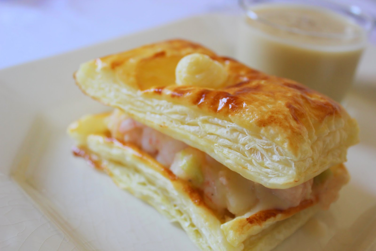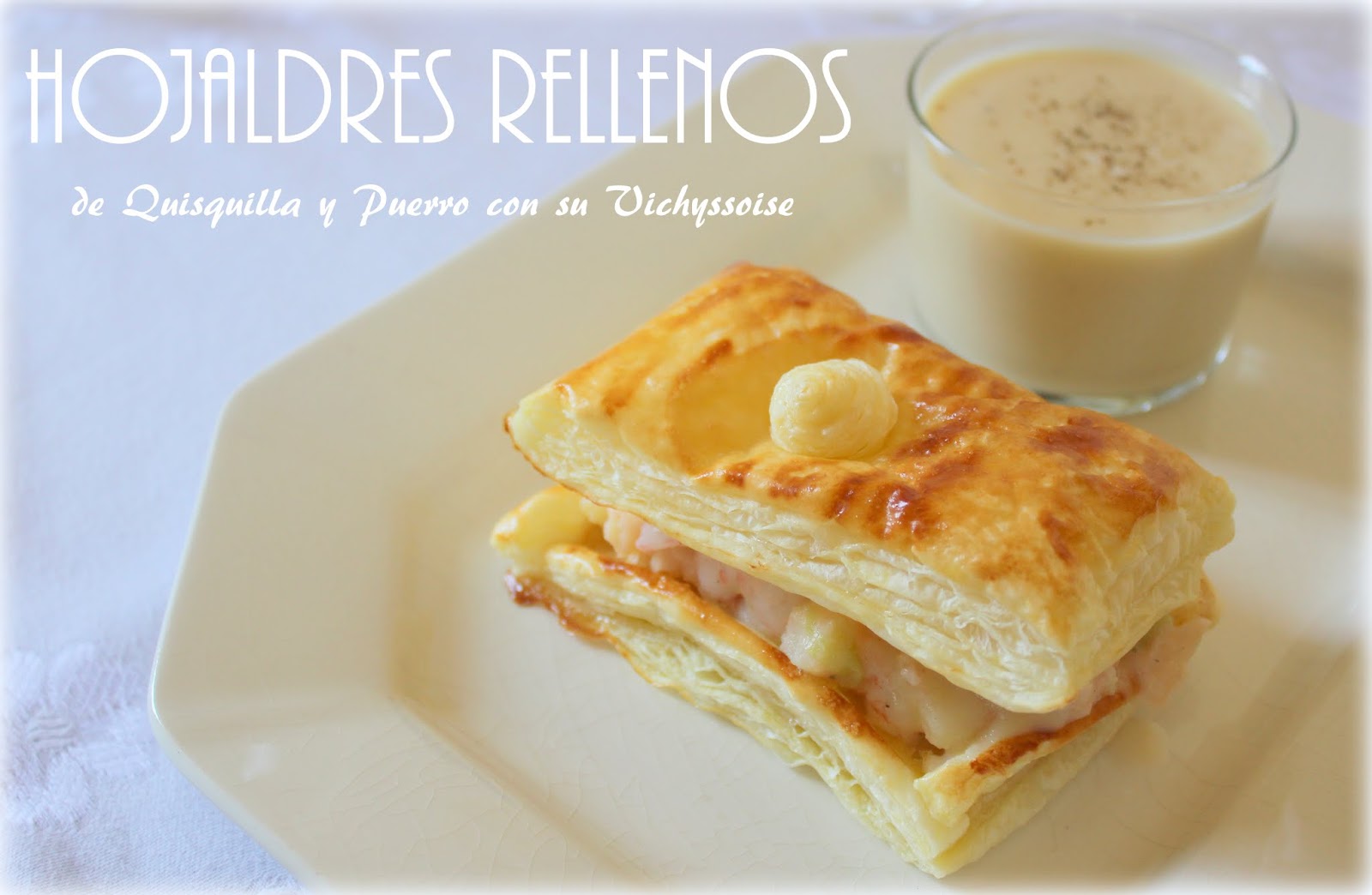 Servimos un vasito de la crema vichyssoise con una pizquita de pimienta y al lado en el mismo plato (a ser posible cuadrado o rectangular), ponemos el hojaldre hueco relleno con las verduras y quisquillas, regado por un par de cucharadas de la vichyssoise y tapado con el hojaldre de la florecita.