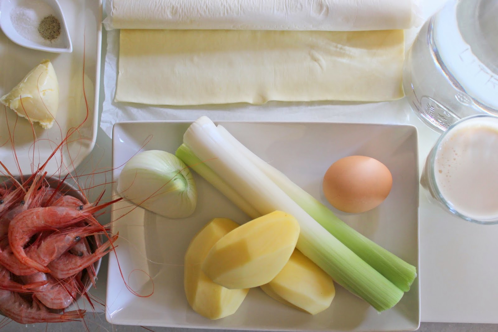 Poner el horno a calentar a 180ºC. Pelamos las quisquilla y reservamos, poniendo a cocer las cabezas y cáscaras en el litro de agua con la mitad de la sal y hacemos un fondo que usaremos después. Cortamos las verduras y las rehogamos en la mantequilla, pochándolas pero sin dejar que se doren. Añadimos a las verduras la leche evaporada, el resto de la sal, un poco de pimienta y el caldo colado preparado anteriormente. Ponemos a fuego medio alto y cocinamos durante media hora removiendo de vez en cuando para que no se agarre.