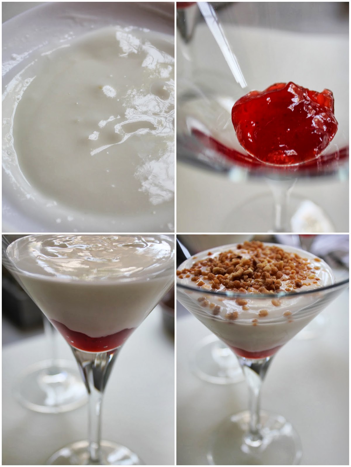 Batimos ligeramente el yogur, usando copas de martini, ponemos en el fondo una cucharada de mermelada en cada una, rellenamos hasta un poco más de la mitad con el yogur y espolvoreamos con una cucharadita de almendra.