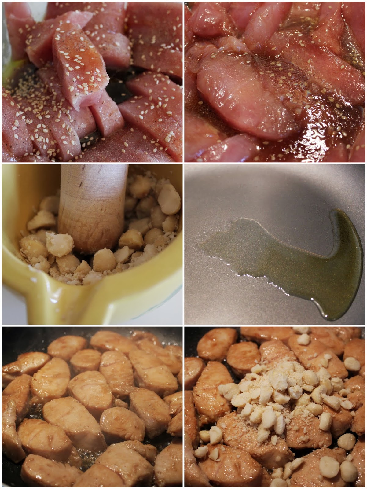Ponemos a marinar los medallones de solomillo de pavo con la soja, la miel, el aceite de oliva (reservando un poco para la sartén), el aceite de sésamo, el ron y las semillas de sésamo durante al menos media horita.