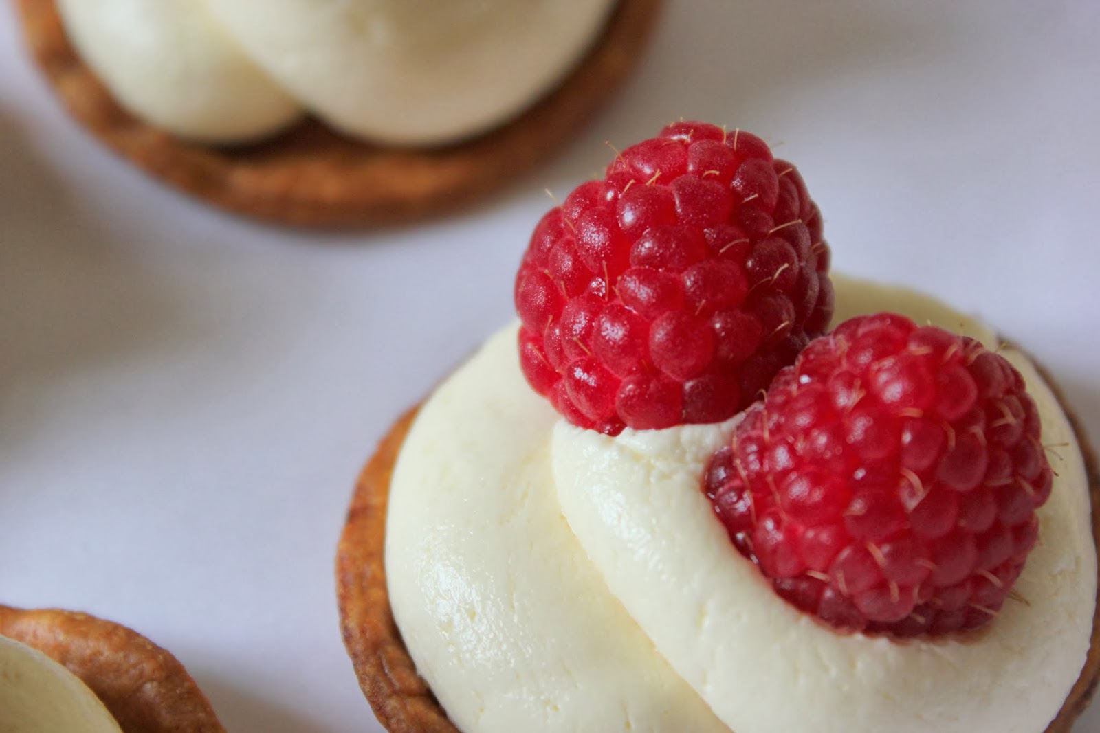 Para montar los bocaditos, lavamos y secamos las frambuesas con cuidado de no romperlas. Cubrimos cada tartaletita con la crema de mascarpone y rematamos con un par de frambuesas y, si se desea, con una florecita horneada.