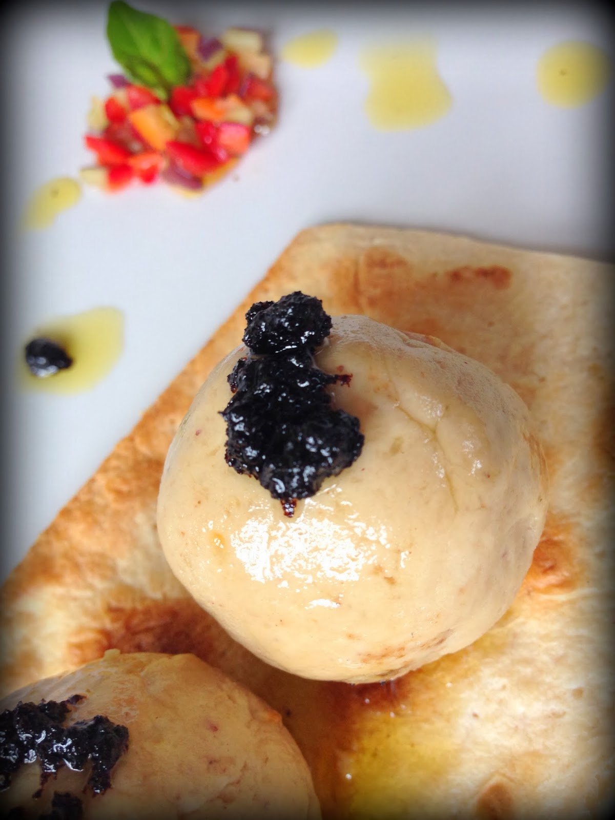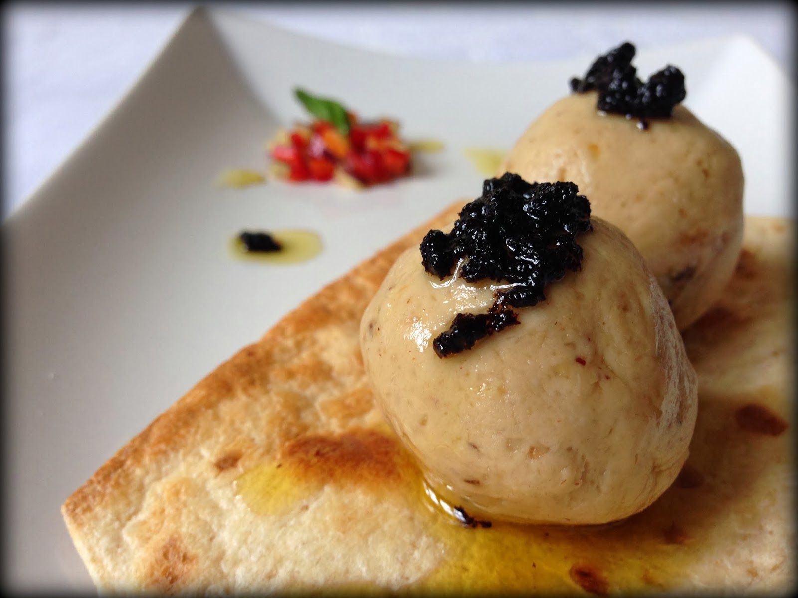 «Cheese Balls con Ajo Negro, su aceite, Avellanas y Guarnición de Chiles».