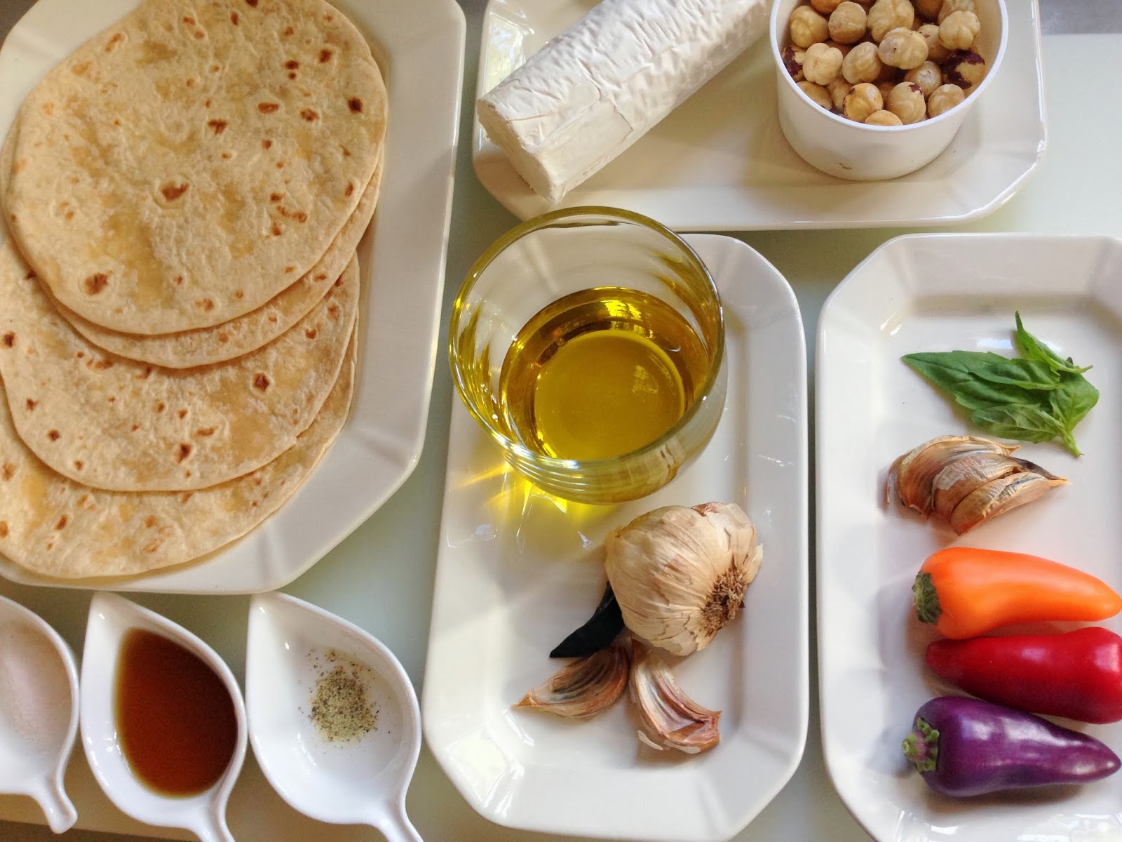 Cortamos dos de los lados a las tortillas de trigo, como se ve en la foto, para darles forma rectangular y las tostamos en el tostador de pan. Colocamos una tortilla de trigo en cada plato, con la pasta de queso y avellanas formamos bolas del tamaño de pelotitas de ping-pong y colocamos 2 sobre cada tortilla de maíz, añadimos una pequeña cucharadita de chiles en una esquina del plato y ponemos encima una hojita de albahaca. Regamos las bolas con un par de cucharadas del aceite con el ajo triturado y servimos.